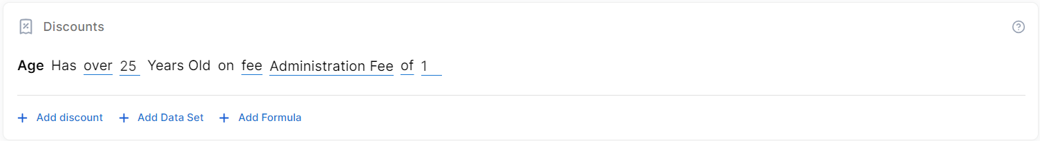 4. The Discounts section is configured to apply a discount of 1 EUR on the Administration Fee configured earlier, only for customers who are over 25 years old.