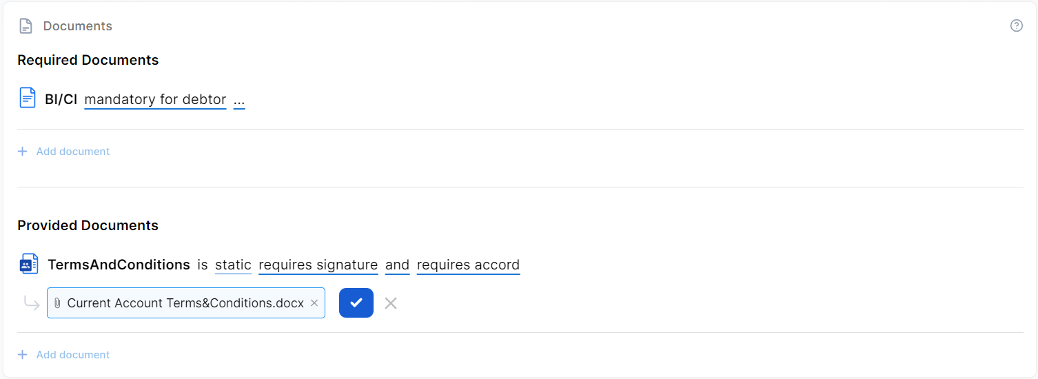 Documents that the applicant must provide in order to verify identity, income, product eligibility, etc. To add a required document: