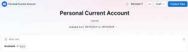 1. For our use case, in the Main Info section, we've set the currency for the current account to Euro (EUR), and the product is available from 09/14/2023 to 09/14/2028.
