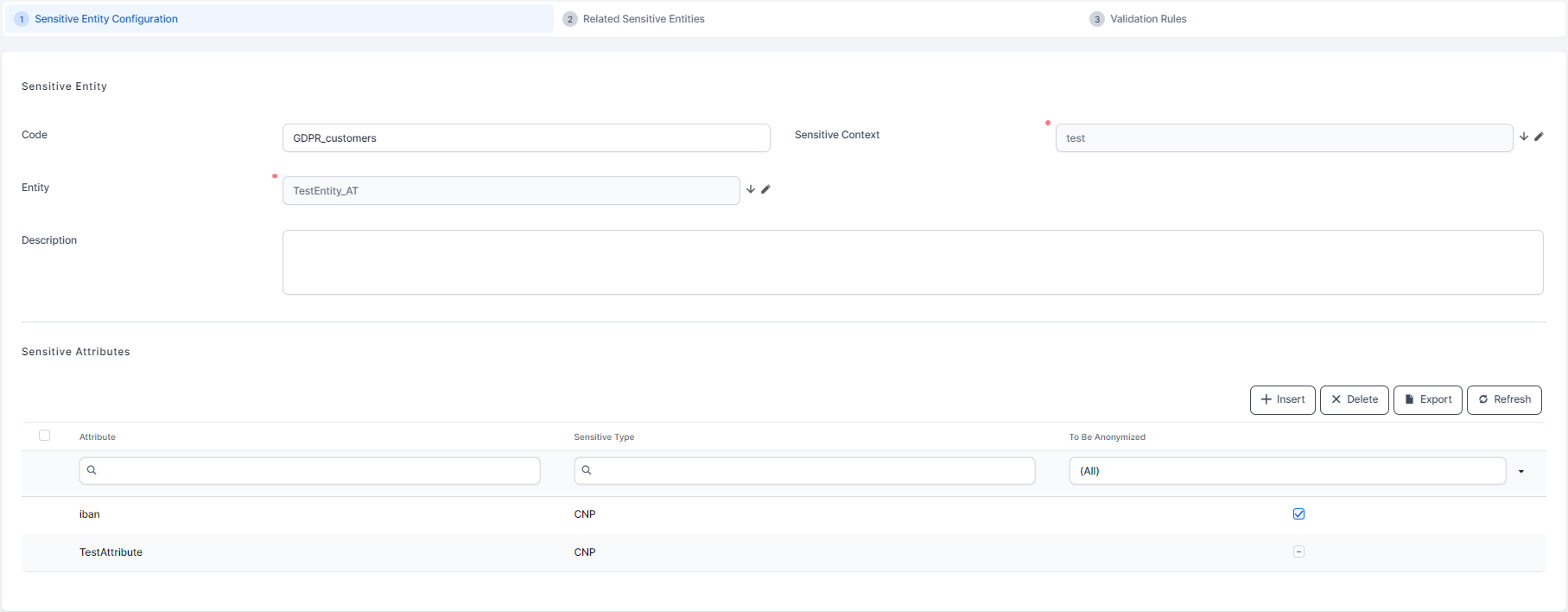 Each sensitive data definition is built around a sensitive entity (and, optionally, its related entities) on which the anonymization is applied. The sensitive data definition also specifies the validation rules that must be fulfilled in order to allow the anonymization.
