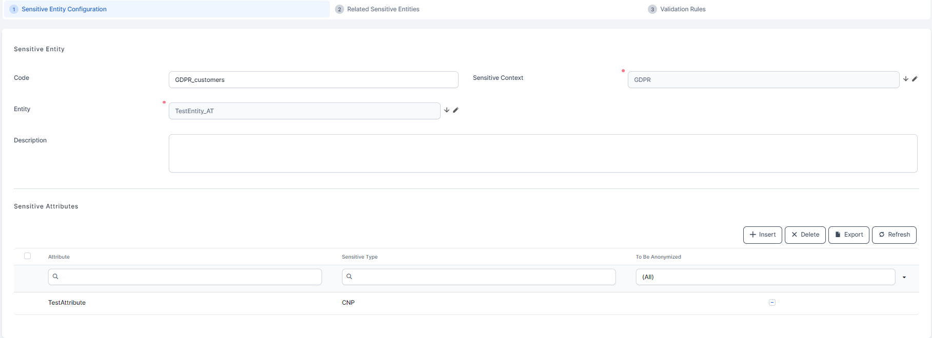 - Sensitive Type - Attribute classification used by operators as search criterion when performing Data Anonymization Requests. The following values are available: CNP, Name, Phone, First Name, Last Name.NOTE