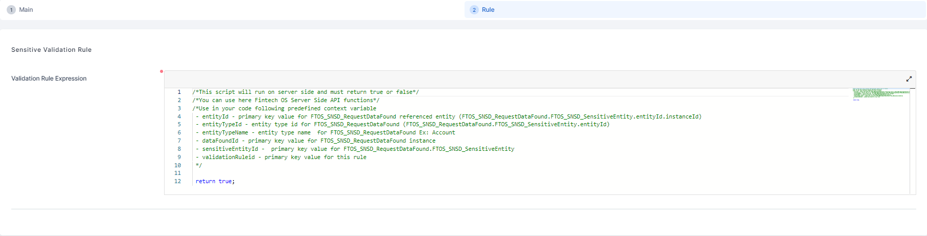 - In the Rule tab specify the expression of the validation rule. The expression must return true in case of a successful validation or false if the validation fails.