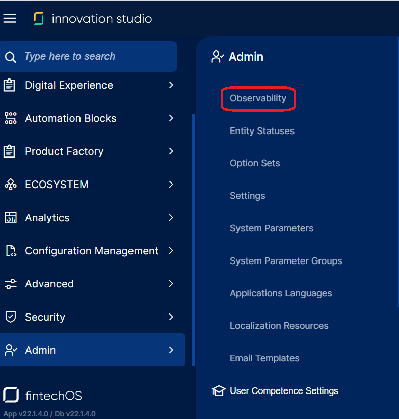 Also, in FintechOS Studio, you need to use the "Observability" security role to map a connection between your established roles and the Observability menu item displayed in the UI. For more details on security roles, see the Manage Security Roles page.