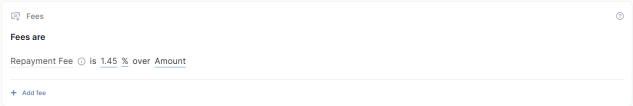 To set up a feeClosed Fees are charges and costs that customers have to pay for specific services and transactions, such as processing a loan application, ongoing support, early repayment, or account maintenance. Fees differ from the main costs of a loan or insurance (the loan's principal/interest or the insurance's premium) in that they typically cover operational expenses and are not related to the loaned/insured amount. for your product:
