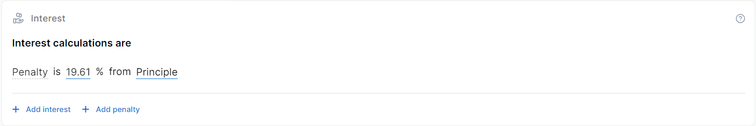The interest sets up the amount of money (which is distinct from the principal repayments) that the borrower pays as a cost for borrowing money when repaying the loan. You can set up both regular and penalty interestsClosed Additional interest charged when a borrower fails to make timely payments on a loan (misses a payment deadline or makes a payment that is less than the agreed-upon amount)., with interest ratesClosed The interest rate is the amount a lender charges a borrower and is a percentage of the principal (i.e., the amount loaned). that are fixed, variable or based on a formula.
