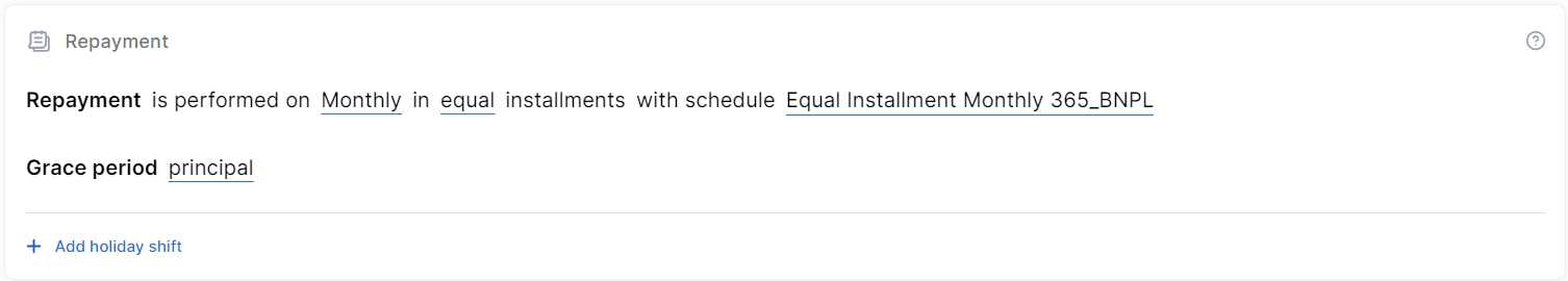 The Repayment section determines the periodicity and repayment schedule for the loan's installmentsClosed Regular payment that a borrower is required to make to the lender to repay a loan over time., and how the repayments are impacted by holiday shiftsClosed Adjustment of installment due dates that coincide with public holidays by moving the due date to the last working day prior or first working day after the holiday. and grace periodsClosed A specified period of time during which a borrower is not required to make regular loan payments without incurring late fees or penalties. Typically granted immediately after the loan disbursement or before the start of the regular repayment schedule..