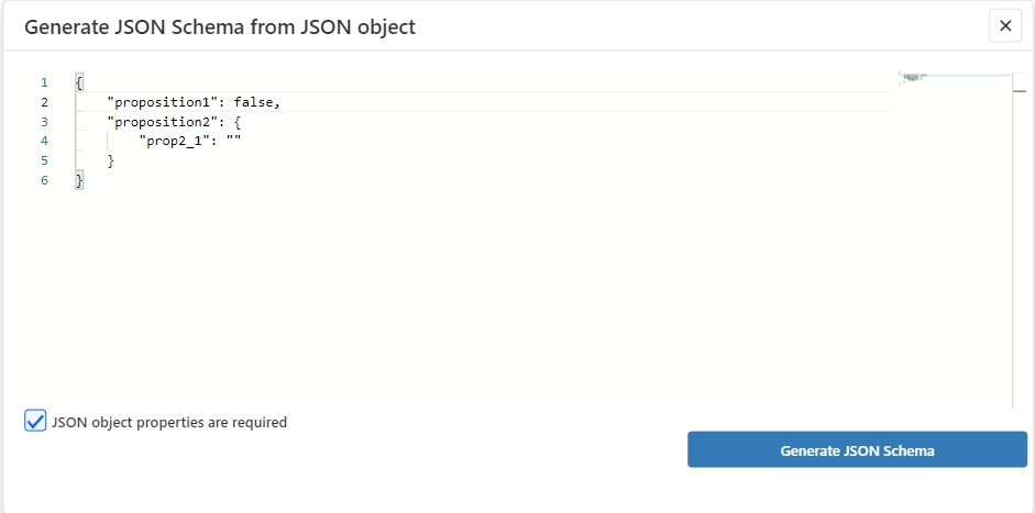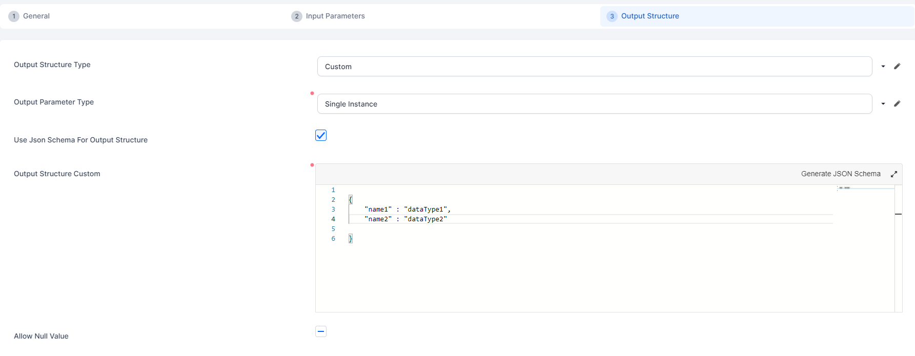 If you checked the Use Json Schema For Output Structure box, add in the Output Structure Custom field a JSON schema or create one from a JSON object using the Generate JSON schema button as mentioned in the Customize the Input Parameters section.