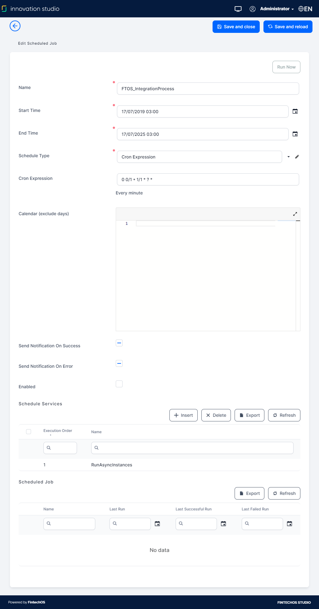 - Click Save and reload. The record is saved in the system and the Edit Scheduled Job page appears.