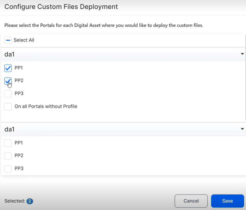 - In the Configure Custom Files Deployment, select the portal profiles where you want to deploy the custom files. Perform this step for each digital asset.