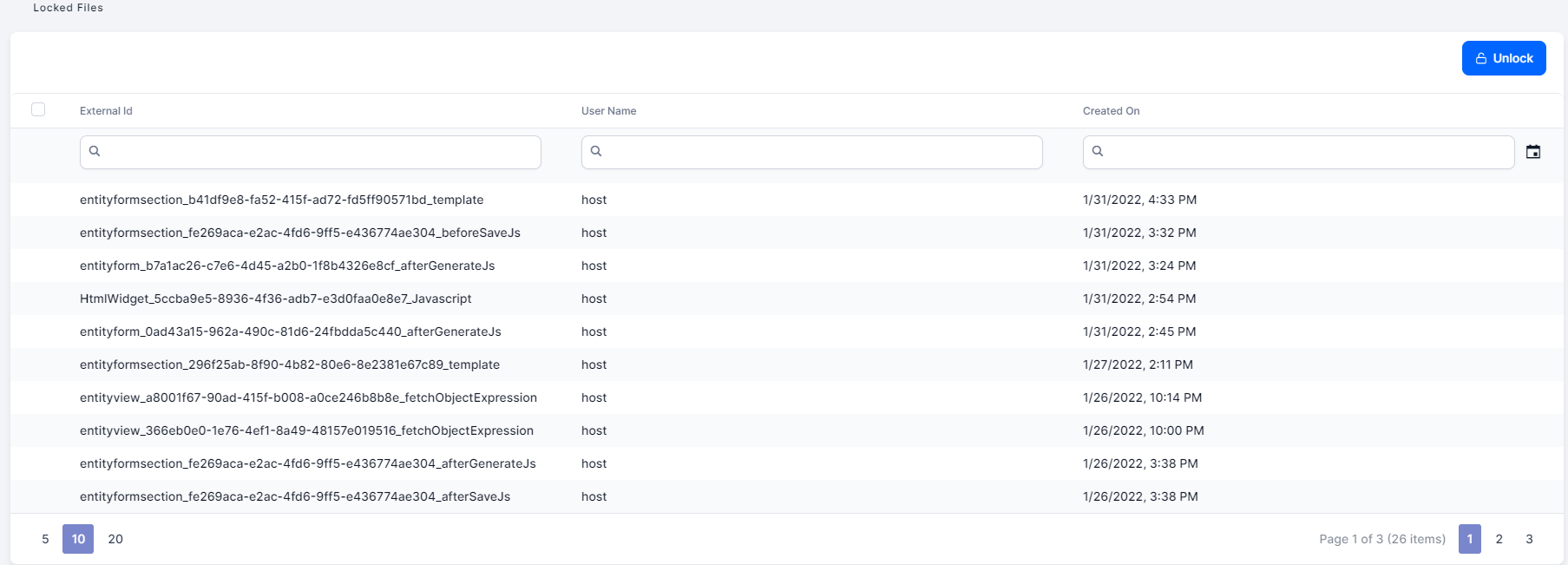 To view all the currently checked out configuration items, in FintechOS Studio, go to Main Menu > Configuration Management > Manage Locked Files.