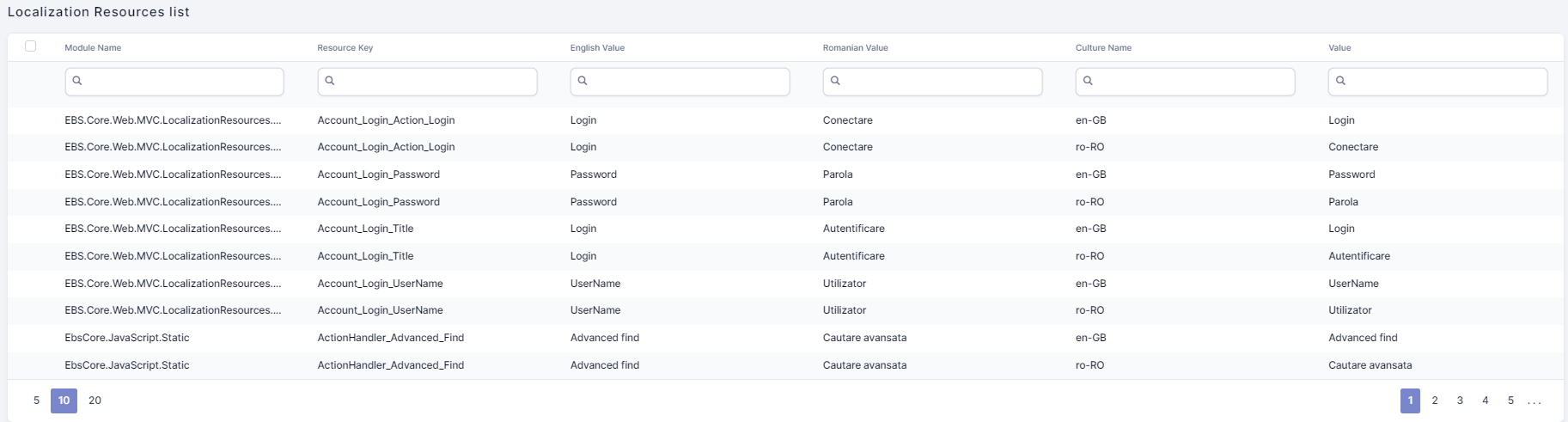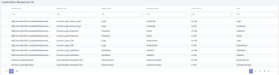 To view the list of UI generic resources, go to Main Menu > Admin > Localization Resources. The list displays all UI localization resources sorted automatically by module, key and culture.