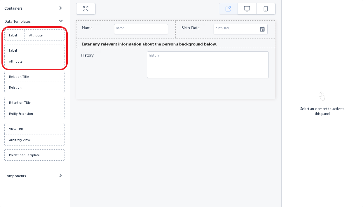 - In the UI Designer's left panel, from the Data Templates section, select a vertical or horizontal attribute template and drag it to the working area in the desired position. For more information, see Adding UI elements to the user interface.