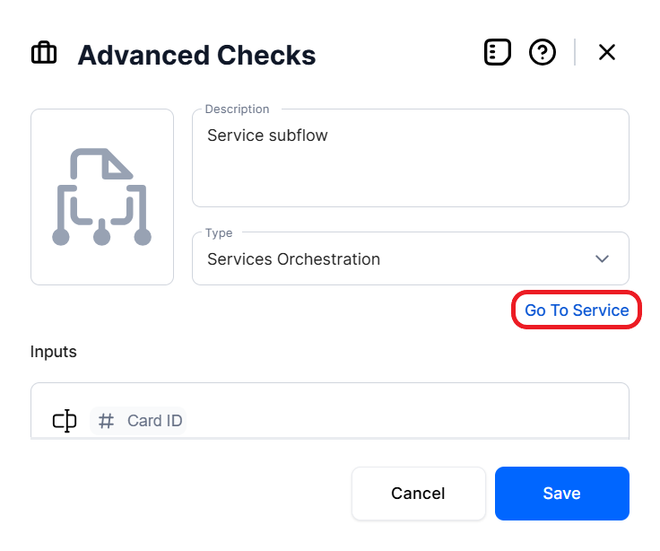 These services include a Go To Service link, which opens a dedicated editor where you can design a sub-flow for your service orchestration.
