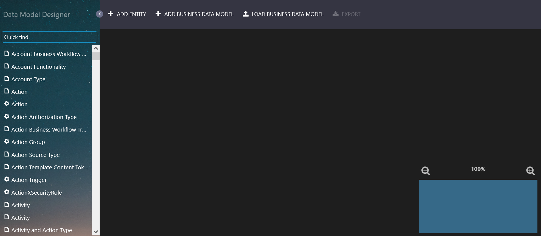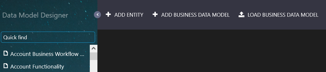 The Toolbar provides you with the buttons needed to perform common functions: Add Entity, Add Business Data Model, and Load Business Data Model. When a data model is open, the right-side of the toolbar contains additional icons which give you the means to save (