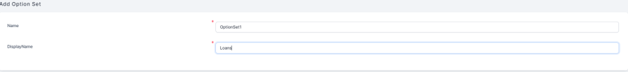 Field Description Name The option set item name which will be used by the system. Display Name The option set name which will be displayed in the user interface. NOTE