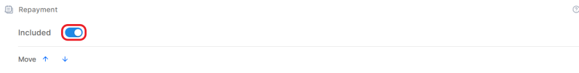 - Includes down payment - Adds a field to configure an up-front partial payment (e.g.: for loan products such as mortgages).