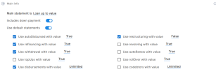 - Main statement is - This option allows you to configure the currency, amount limits, and time ranges for loan repayments or deposit terms.