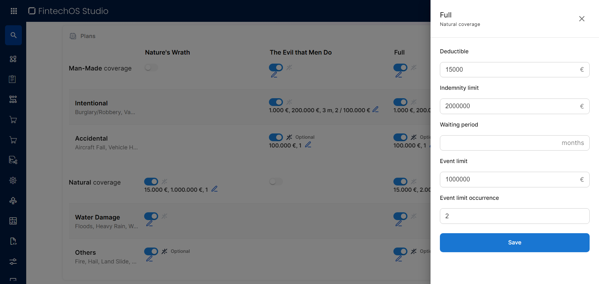 - In the side-panel that appears, modify the Deductible, Indemnity limit, Waiting period, Event limit, and Event limit occurrence fields as needed.