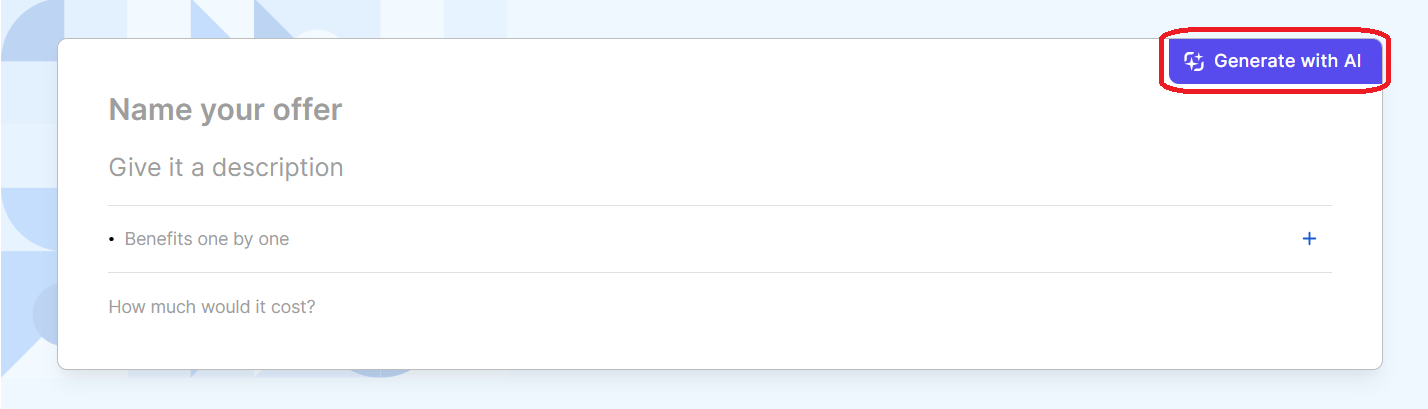 You can pre-populate the Name, Description, and Benefits fields by clicking Generate with AI. This functionality draws data from your offer's product(s) and generates a comprehensive introduction for your offer.To activate AI generation, you must enable the sys-pf-enable-ai system parameter (see System Parameters for details).IMPORTANT!