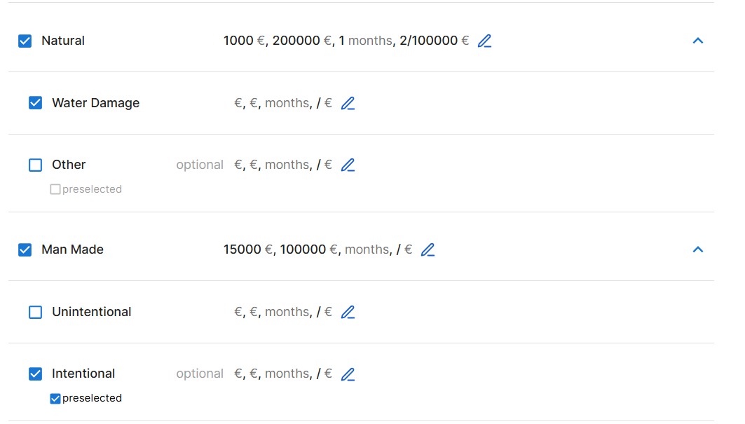 Amount of time an insured party must wait before some or all of their coverage comes into effect., or event limits), overriding the values set at the plan or product level. - Use the preselected checkbox to mark the optional coverages or subcoverages that should be enabled by default when a user opens the card.