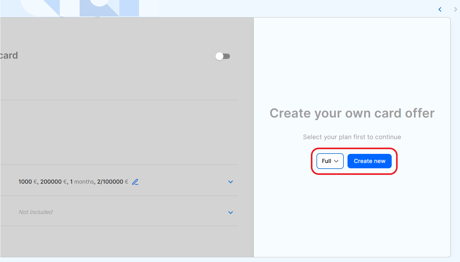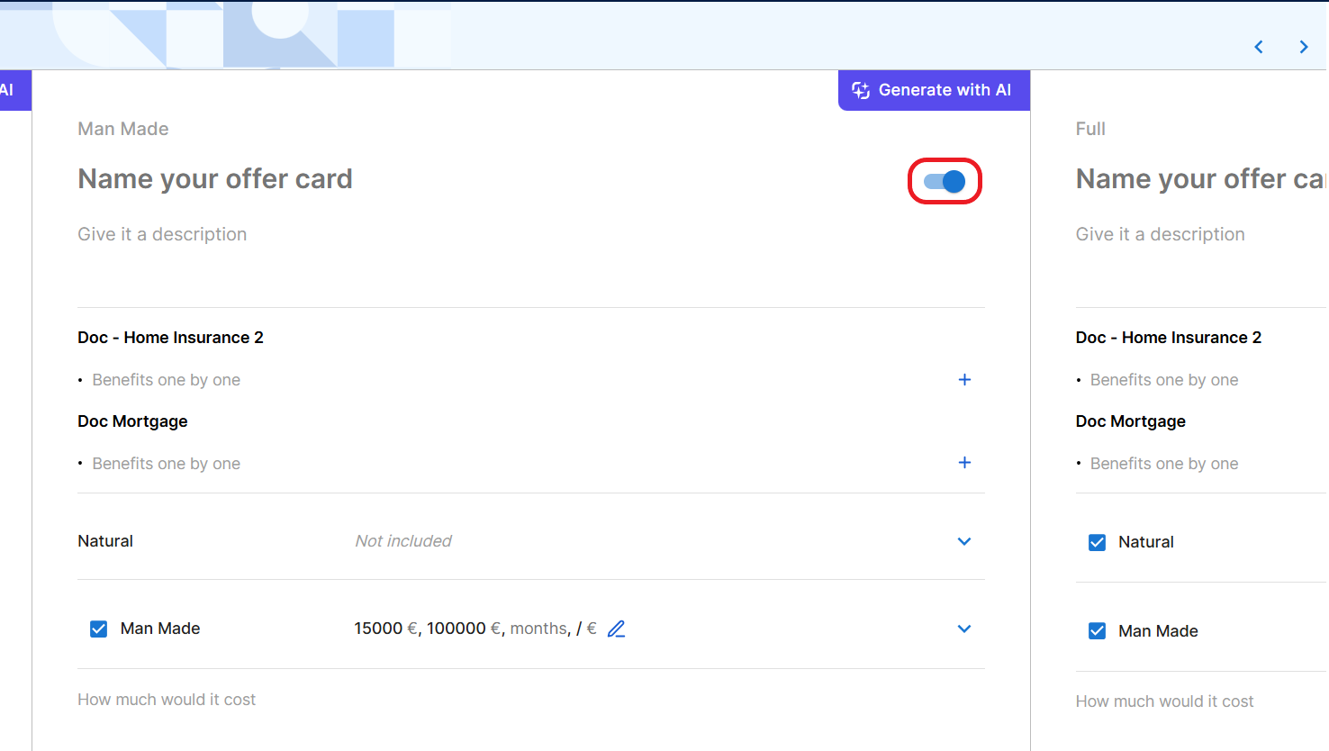 To enable or disable a card on the offer, use the toggle at the top right corner of the card. This allows you to create targeted offers with specific plans.