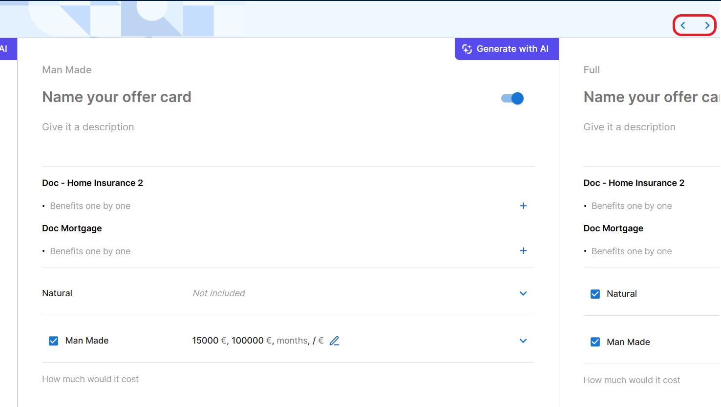 By default, a content card is created for each insurance plan of the main product. (use the < > buttons to navigate between cards).