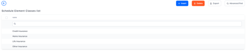 - In the main menu, click Products > Settings > Schedule Element Class, and the Schedule Element Classes list page opens.