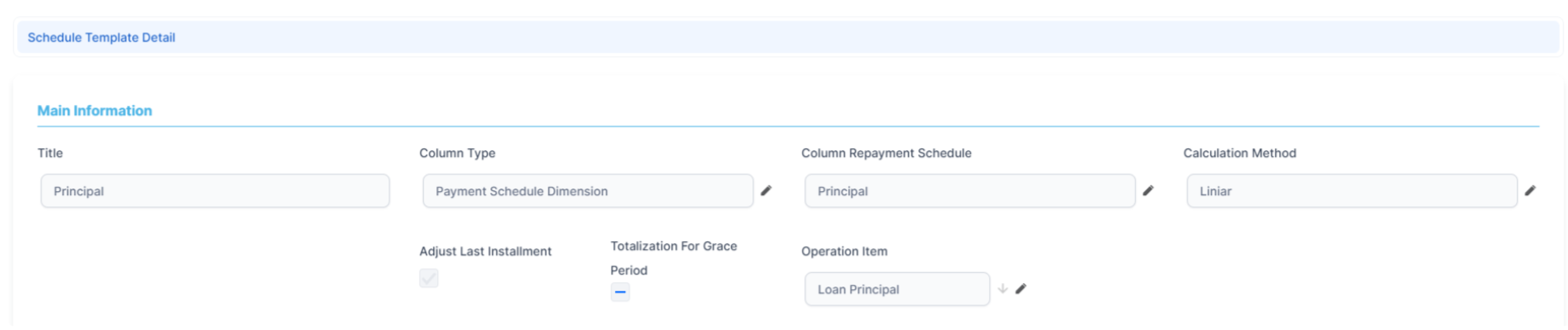 - Formula: This checkbox is available when the Calculation method is set to Column Formula or Remaining Formula or Once or LiniarOnYear. The formula can use other Schedule Details Names. For example, for a total installment calculated as Principal+Interest+ManagementFee that were added to Payment Schedule Type Details earlier.
