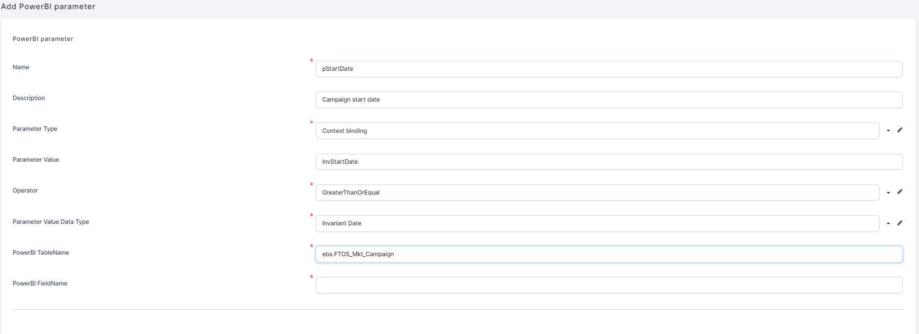 | Power BI FieldName | The name of the Power BI field that will be mapped to the specified parameter. |