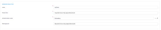 - In the Workspace ID field, type the unique identifier of the Power Bi workspace holding the report. This parameter is required when the authentication mode is Embedding.