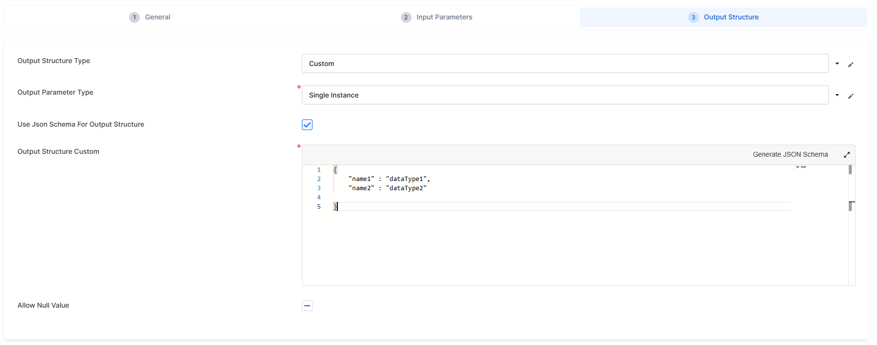 If you checked the Use Json Schema For Output Structure box, add in the Output Structure Custom field a JSON schema or create one from a JSON object using the Generate JSON schema button as mentioned in the Customize the Input Parameters section. - When leaving the Allow null value option unchecked, this parameter requires a value. Check to allow null, making it optional in the automation script. By default, this option is unchecked, meaning it requires a value.