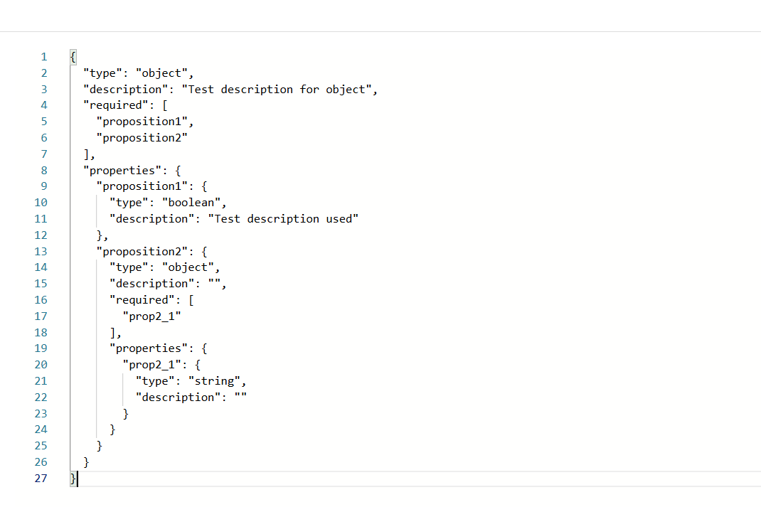 After saving the input parameter, the description of the JSON object and its properties will be displayed when using intelligent code completion (IntelliSense) in the code editor.