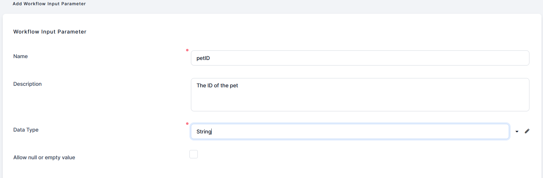 Allow null or empty valueWhen unchecked, this parameter requires a value. Check to allow null, making it optional in the automation script. By default, this option is unchecked, meaning it requires a value.