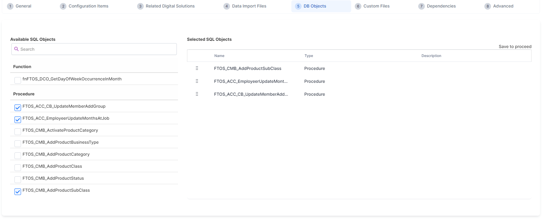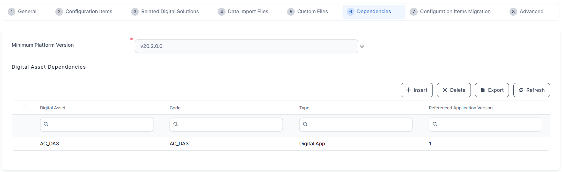 - Click the Dependencies tab. From the drop-down list, select the Minimum Platform Version with which the digital asset is compatible with. Once selected, the digital asset cannot be imported in a prior version of the FintechOS platform.