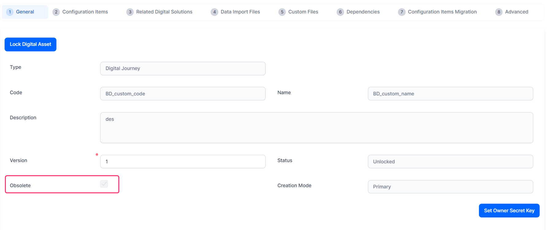 Some official FintechOS digital assets have controlled distribution and are locked by FintechOS to ensure their integrity. In this case, a Set Customization Key button is displayed in the interface. This button allows you to insert an unlock code provided by FintechOS to unlock the asset if you need to edit it.