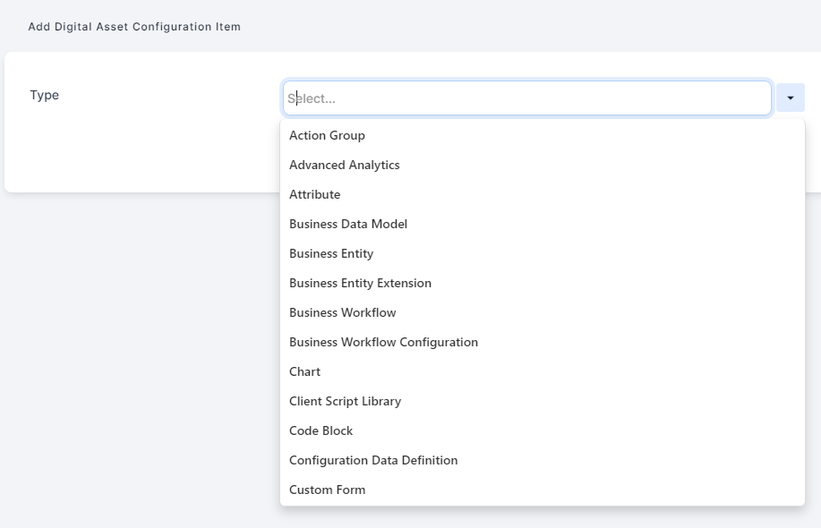 The Add Digital Asset Configuration Item page is displayed. The Type field allows you to select the type of configuration item.