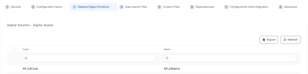 This tab typically includes all the components required for the digital asset to work, such as entities, form driven flows, entity views, scripts, configurations for the automation processors, and any other configurations made while the digital asset was set as context.