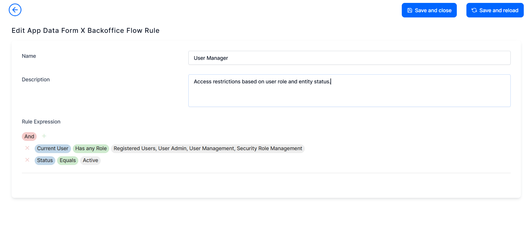 Users who will initiate the back-office flow require Security Roles with security items that grant them access to the BackOfficeFlowExecution entity (in addition to the flow's source entity). - You can set up multiple availability rules for the same back-office flow.