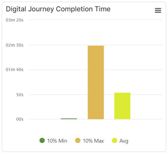 Digital Journey Completion Time – displays the average of the 10% digital journeys that took the least/longest amount of time to complete (in minutes). This could help determine proportionally whether your digital journey is easy to go through or not. The “Avg” metric displays an average between all digital journey instances. This chart counts the digital journeys that are completed successfully, unsuccessfully, or abandoned.