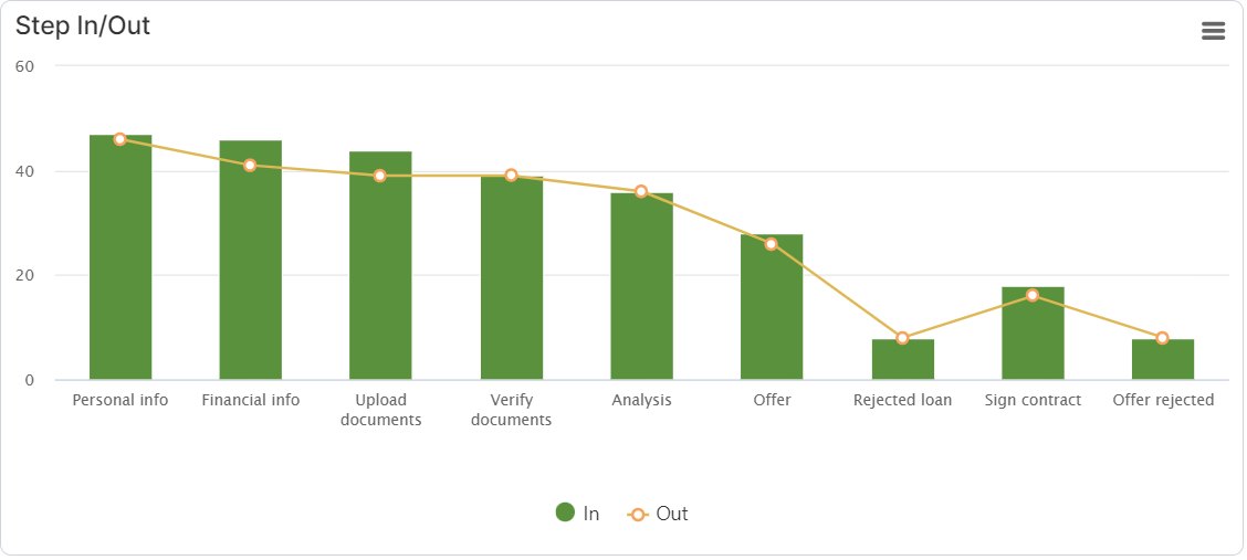 Step In/Out – similar to the Funnel chart, this shows the number of users who went through a step of the digital journey (Step In) and the number of users who moved to a different step from there (Step Out), counting the number of entries per instance. When the user goes through the same step, if the flow control/navigation rules require them to do so, it is considered an entry. It applies to in progress, completed successfully, unsuccessfully, and abandoned digital journeys.