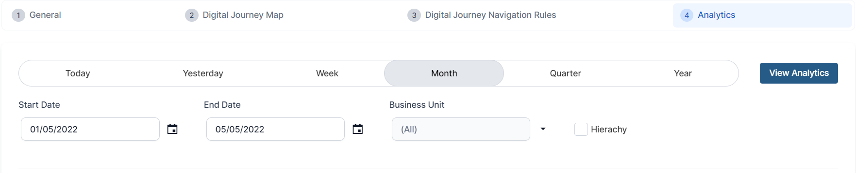 In order to view the analytics charts, the user must have the DjAnalytics or Developer security role assigned to them in the platform. For more information, see Security. All entities from the journey must have business transitions workflows defined. For more info, see Business Workflows.