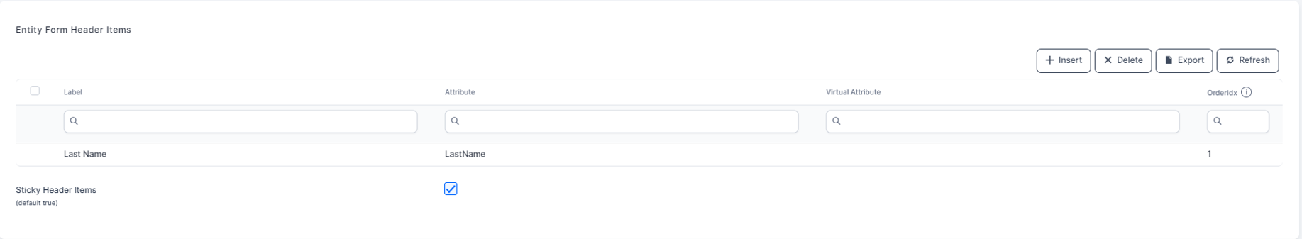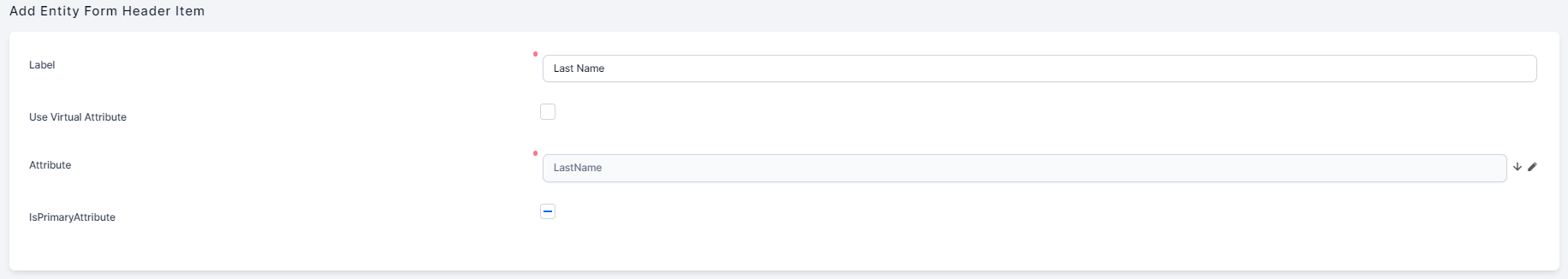 Field Description Label The name of the header item which will be displayed on the form driven flow or app data form. Use Virtual Attribute Select if you wish to display a virtual attribute from the entity's extended data model, instead of a regular attribute. This will replace the Attribute field with a drop-down called Virtual Attribute which will allow you to select virtual attributes instead of regular attributes. Attribute/Virtual Attribute The value of the entity attribute which will be displayed on the header item. If you selected the Use Virtual Attribute checkbox, you will be able to choose virtual attributes from the entity's extended data model. Is Primary Attribute Tick only if the attribute to be displayed in the digital journey or app data form header is also the entity's primary attribute. - Click Save and close. The page refreshes and the header item is displayed in the Entity Form Header Items list.