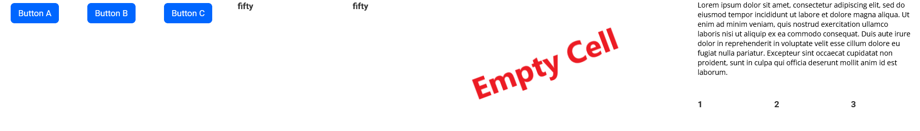 Cells on the same row template are responsive, which means they appear on the same line on desktop devices, but are rearranged one on top of the other on mobile devices. Empty cells take up space in desktop (horizontal) mode, but are collapsed in mobile (vertical) mode.