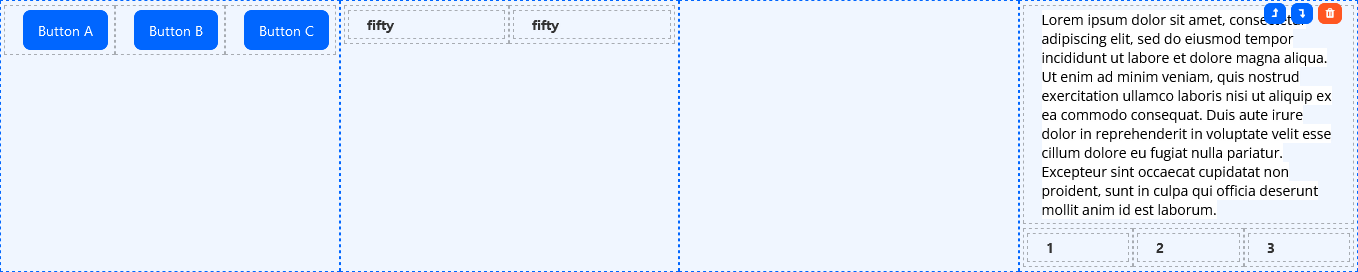To add a row template to the interface, drag and drop its corresponding container from the left panel to the editor's working area (see Adding UI elements to the user interface). Each cell of the template allows you to place data fields, UI components, or even other row templates to further refine your page layout.