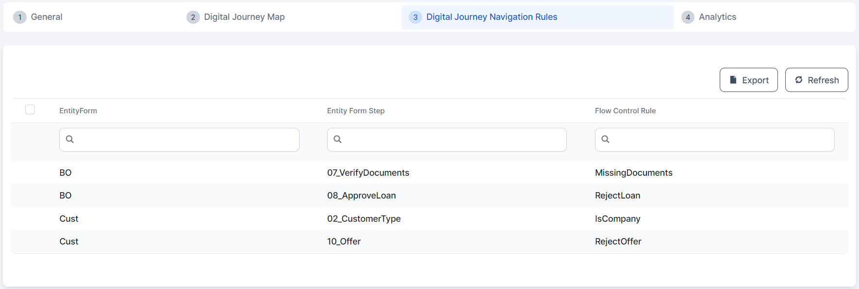 Based on the Digital Journey Map settings, the fields in the Digital Journey Navigation Rules tab will be populated with the step transitions.
