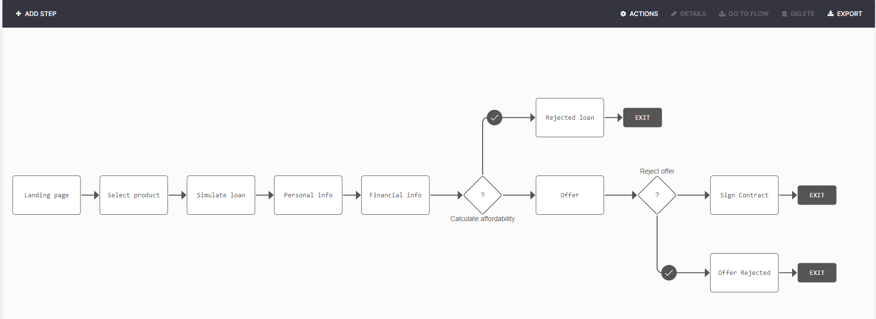 When building a digital journey, it is possible to have many form driven flows dedicated to the same digital journey, but each has a different set of steps that may be related to the other flows. In order to build visually aesthetic journeys with customer flows and operator flows, FintechOS Studio makes it possible to see all the flows on one journey in a map.