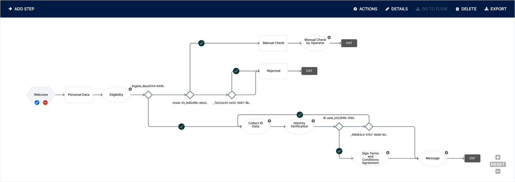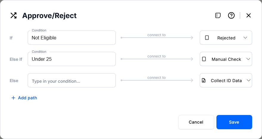 Decisions apply conditional logic to the journey’s data to select between alternative navigation paths. You can choose between two or more navigation paths depending on your navigation logic. For example, underwriting assessments often result in three possible navigation paths: "Approved," "Rejected", and "Manual Verification".