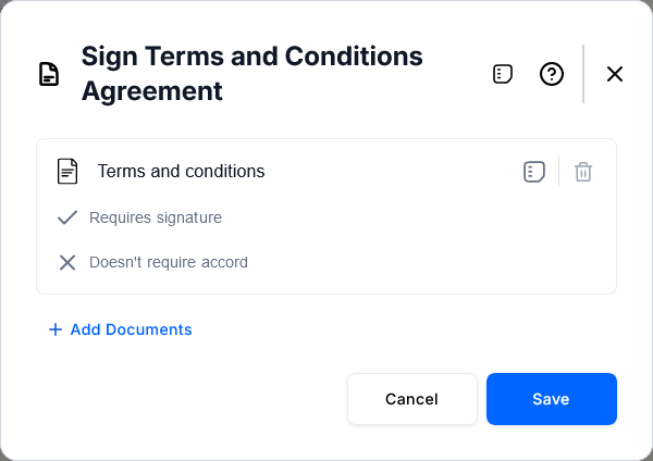 Documents are files that the user must either provide (e.g., proof of identity, income, or ownership) or receive (e.g., terms and conditions or GDPR agreements). You can also specify whether the document requires the user's agreement and/or signature.