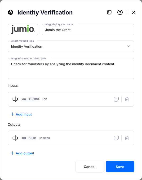 To ensure readability on the canvas, define a clear and relevant title for the integration action, such as "Check Account". Specify the inputs and outputs using data attributes to guide the implementation of the journey. For best effect, attach the logo of the integrated system.