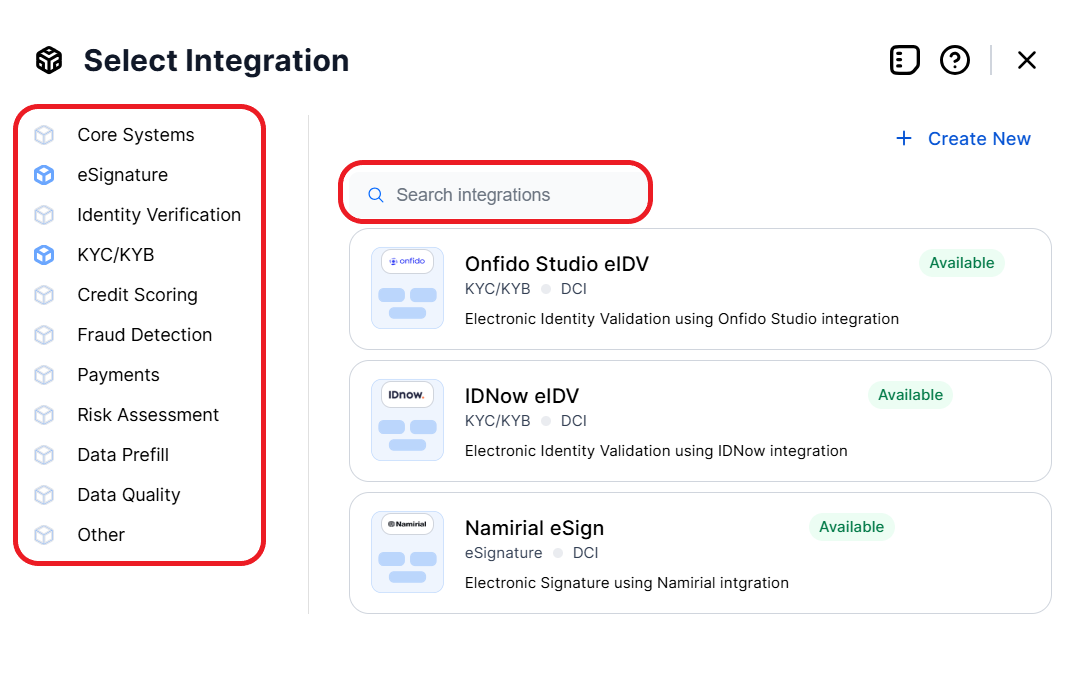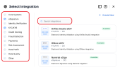 To select an existing integration, use the list on the left to enable or disable filters for the types of integrations you wish to browse or the search box to look for the desired integration by name.